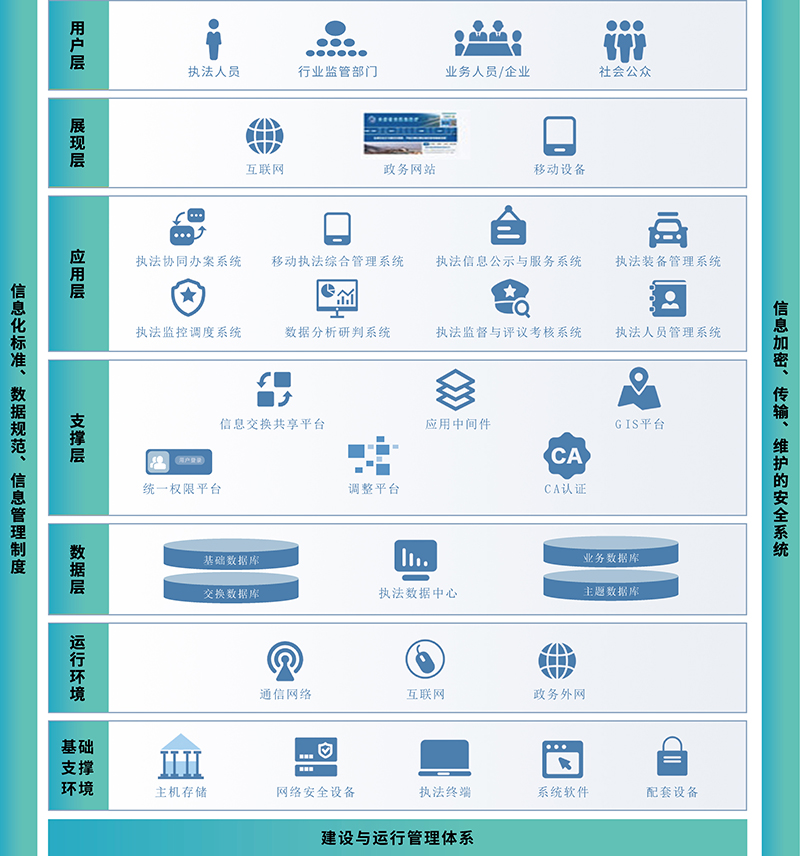 总体架构包括用户层、展现层、应用层、支撑层、数据资源层、运行环境层、基础支撑环境,以及标准规范体系、信息安全体系、建设与运行管理体系等三个保障体系。