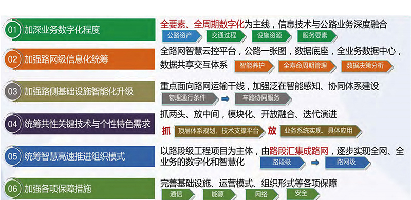 智慧高速是一项全局性、系统性工作,宜立足自身优势,加强顶层设计,统筹数字化转型、路网 布局规划、业务、产业和技术发展实际,开展相关工作。